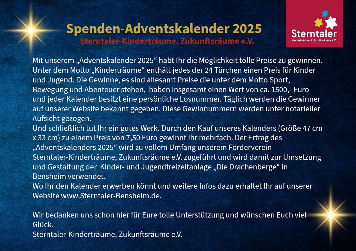Dieser Kalender hat eine Größe von 47 x 33 cm und befindet sich gerade in Druck. Er wird ab Mitte Oktober für 7,50 Euro erhältlich sein. Schon heute können Sie den Kalender unter ➡️Sterntaler.Bensheim@t-online.de vorbestellen.